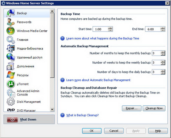 В общих настройках Home Server можно настраивать следующие параметры бекапирования: менять диапазон запуска бекапа, задавать сроки хранения месячных, недельных и ежедневных архивов. Процедура очистки устаревших резервных копий выполняется по воскресеньям.