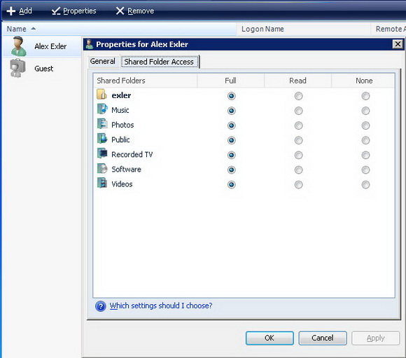 Как видите, вроде все очень просто, но в этой простоте - главная прелесть. Зачем для домашней сети городить домены? Ни к чему это! Нужно завести пользователя, указать для него виды доступов к расшаренным ресурсам. Все. Здесь это делается быстро и удобно.