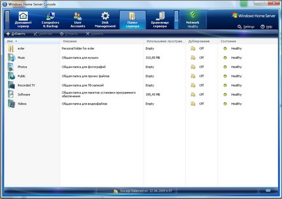 Здесь же для соответствующих папок можно включить так называемое дублирование. Это очень интересная возможность. Если дублирование включено, то WHS информацию из соответствующей папки автоматически дублирует на другом физическом носителе. Таким образом, если какой-то диск вдруг умрет, то, даже если на него писались важные данные, их можно будет восстановить после замены диска. Такой способ хранения, разумеется, значительно повышает надежность.