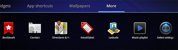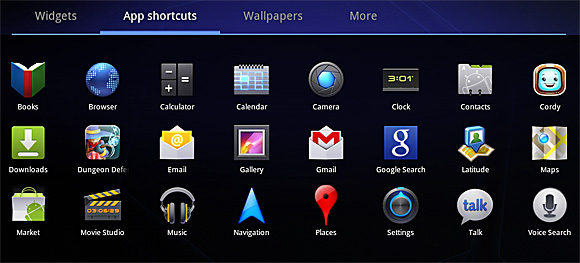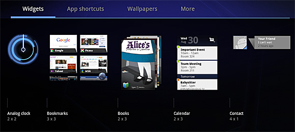 Виджетов на данный момент всего двенадцать, но понятно, что любые другие можно скачать из Android Market. От второй версии виджеты, как правило, подходят, я проверял.