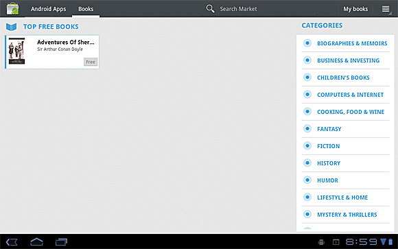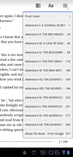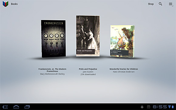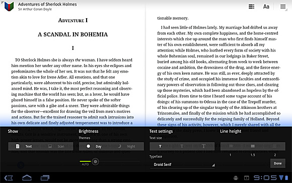 В магазине пока книг очень мало, но они бесплатные. Я так понял, что это тот самый знаменитый проект Google по сканированию книг и хранению их в онлайне. Причем книги хранятся в очень интересном виде - скан с оригинальной книги и распознанный электронный вариант. Как читать - настраивается. Вот, например, "Приключения Шерлока Холмса" - электронный вид.