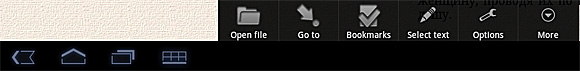 Открываем книгу. В левом нижнем углу кроме стандартных пиктограмм появилась также привычная пиктограмма вызова меню. (Это явно сделано для совместимости с приложениями под вторую версию, потому что в приложениях под третью версию меню появляется справа сверху.)