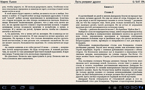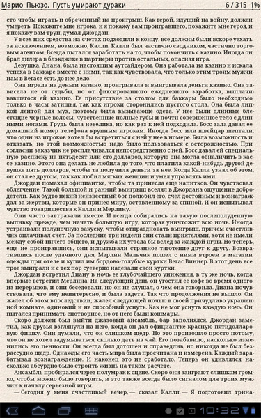 Странички листаются прикосновением пальца к нужной зоне (зоны настраиваются), читать очень комфортно. Единственный минус по сравнению, например, с iBooks от iOS - это то, что при переходе от портретного к альбомному режиму или наоборот проходит где-то три-четыре секунды, за время которых переформатируется текст. В iBooks страницы переворачиваются максимум за секунду.