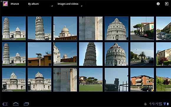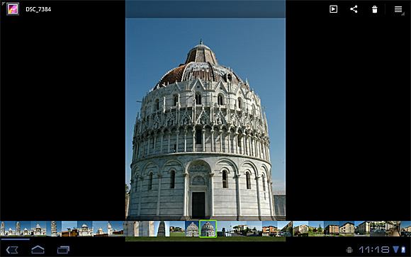 При выборе фотографии она разворачивается на полный экран, а снизу идет линейка с маленькими пиктограммами предпросмотра других фотографий. Все это один в один, как в iOS.