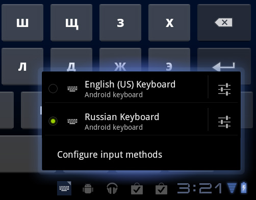 В общем списке поддерживаемых раскладок кириллица присутствует, и ее можно добавить к языкам ввода. Переключение теперь происходит не по жесту по пробелу, как во второй версии, а по специальной кнопке - появляется окно выбора.