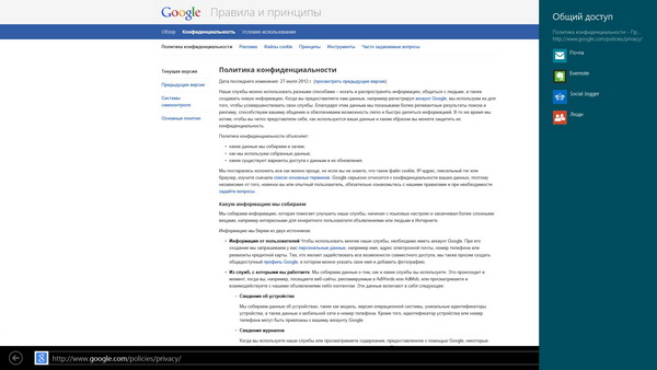С помощью общего доступа ссылку на страницу, открытую в браузере, можно отправить по e-mail, записать ее в Evernote, поделиться в социальных сетях или отправить конкретному человеку из списка ваших абонентов.