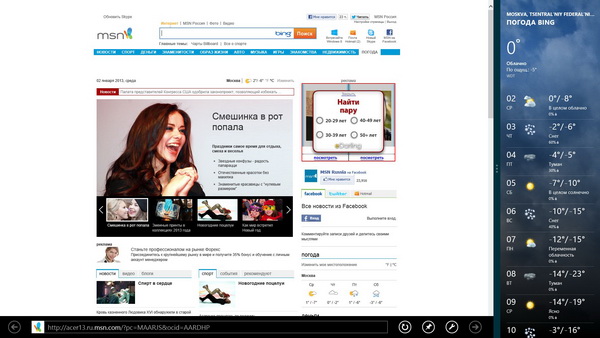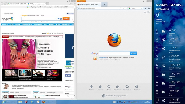 В новом интерфейсе Windows 8 подобное предусмотрели: на экране можно открыть сразу два приложения под Metro, причем одно из них занимает примерно 1/5 дисплея, а другое - 4/5. Чтобы поместить приложение в окно справа или слева - его просто нужно сдвинуть в соответствующую сторону.