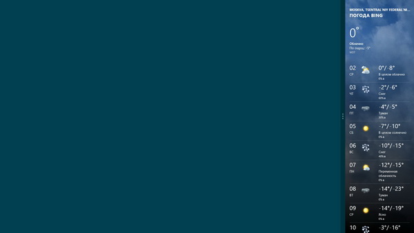 Некоторые из приложений под новый интерфейс Metro хорошо рассчитаны на то, чтобы функционировать в режиме небольшого бокового окна: те же "погода", "музыка" и еще некоторые. С другой стороны, например, "магазин" переводить в боковую полоску нет никакого смысла: там просто будет надпись "магазин".