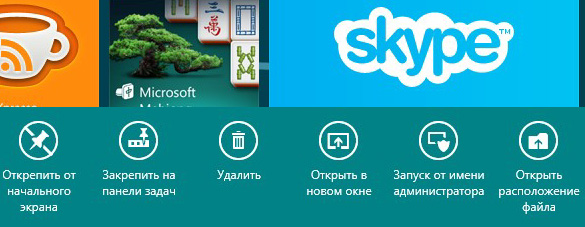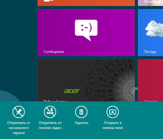 Если щелкнуть правой кнопкой мыши по конкретной плитке, то снизу появляется так называемая панель приложений (App bar). Плитку (пиктограмму) можно: откреплять от начального экрана, прикреплять-откреплять к панели задач обычного десктопа (как в Windows 7), изменять размер (если плитка позволяет), удалять, открывать приложение в новом окне и так далее.