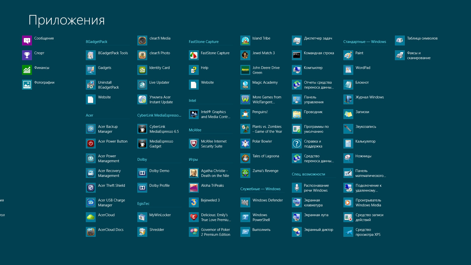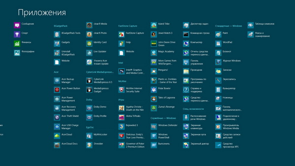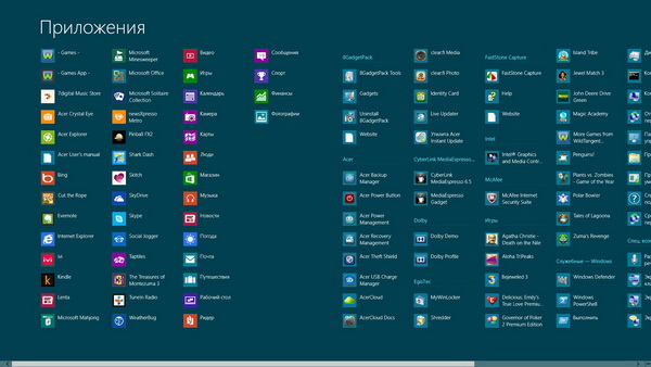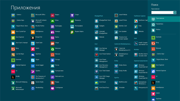 Полный список всех приложений доступен по пиктограмме "Все приложения" в нижней панели приложений. Там все программы представлены в виде маленьких пиктограмм-квадратиков. Сначала идут приложения под Metro, затем группы остальных приложений.
