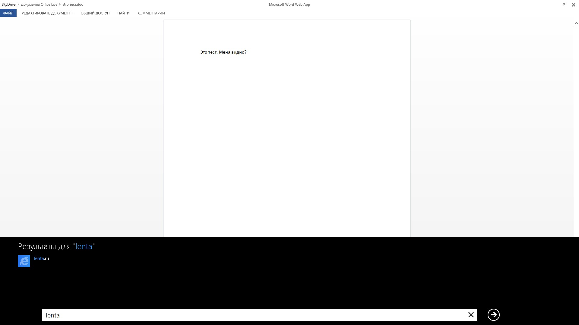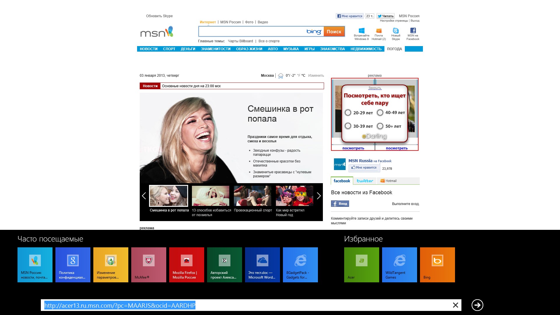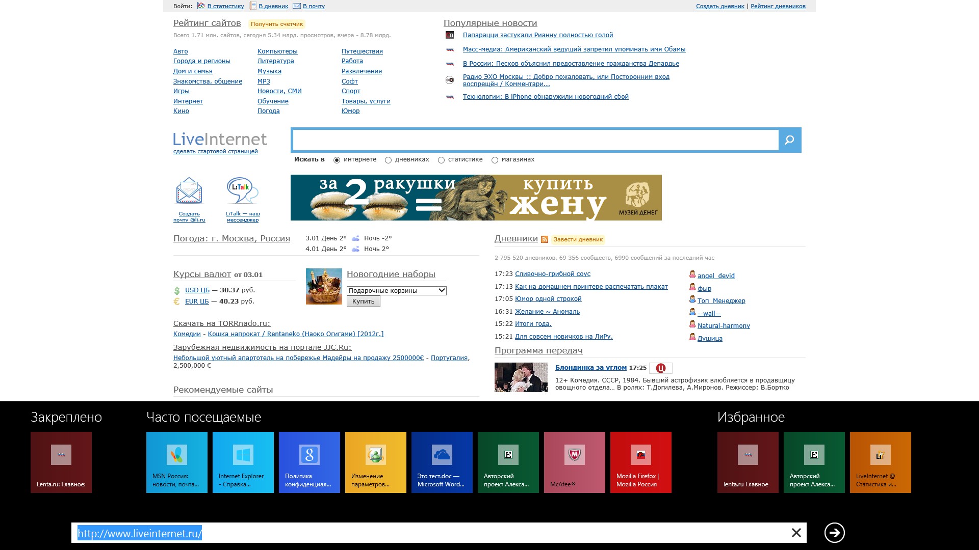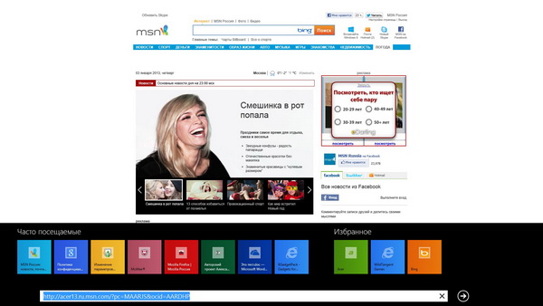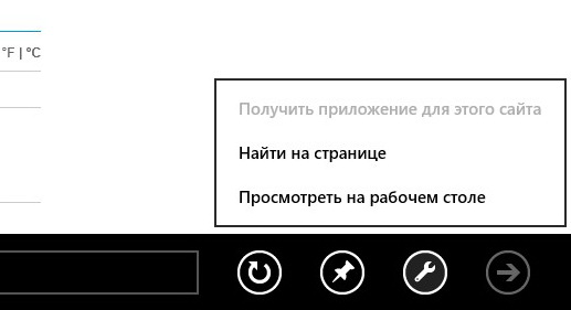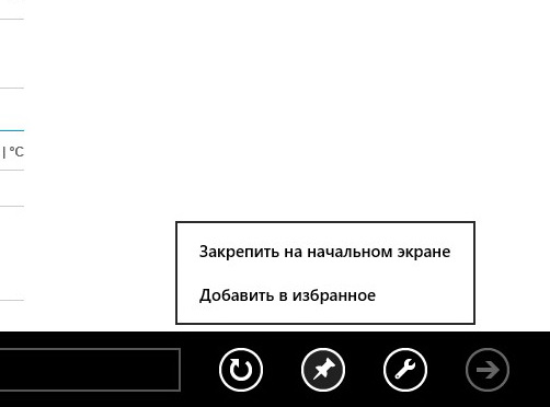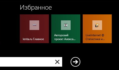 MSIE под Metro. Минималистичный дизайн, крупные пиктограммы управления. Адресная строка находится снизу.