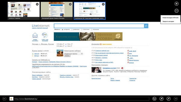 Вкладки (несколько сайтов в одном окне) здесь поддерживаются, их можно вызвать в верхней панели. Есть возможность открыть новую вкладку в режиме InPrivate - это безопасный серфинг с удалением при закрытии браузера всех данных, сохраненных на ПК при просмотре данной вкладки.
