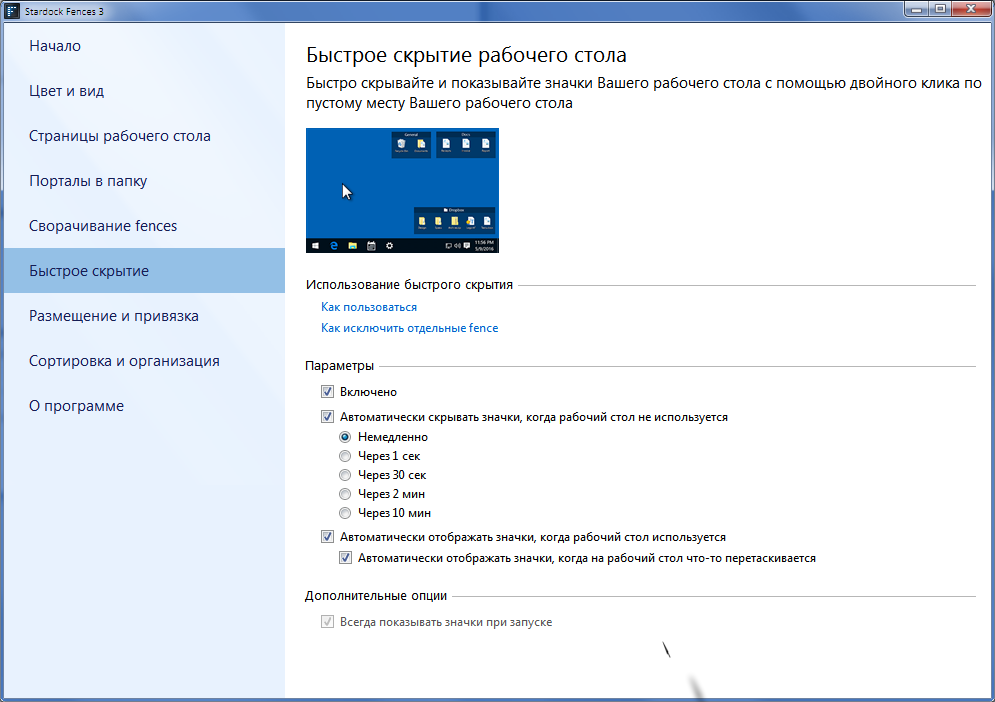 У меня десктоп теперь выглядит вот так. При этом фоновая картинка, как я уже написал выше, меняется каждые 10 минут (это настраивается в "Дисплей - Персонализация - Фон"). А те пять иконок, которые там остались, я раз в пару дней перемещаю в другое место.