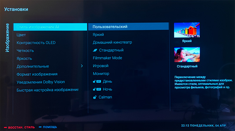 • соответствие видео (стандартный, естественный, спорт, яркий, игровой);