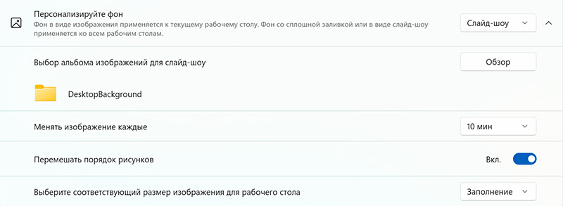 Но это сделать очень просто: для старых Windows нужны специальные программы, для Windows 11 просто в настройках нужно указать использование слайд-шоу для фонового изображения и эти изображения менять раз в сколько-то минут - я ставлю значение 10. И это еще и прикольно, а то надоедает одна и та же картинка на десктопе.