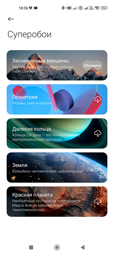 Появились совершенно новые суперобои. Кстати, эти суперобои не так-то просто быстро найти - мне пришлось потратить на это какое время. Потому что поиском через настройки они не обнаруживаются, а когда вы в настройках просто заходите в раздел обоев, то получаете вот такой раздел, где есть обычные обои по категориям, живые обои старого типа и живые обои, разработанные для MIUI 13 (о них мы поговорим чуть позже).