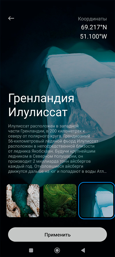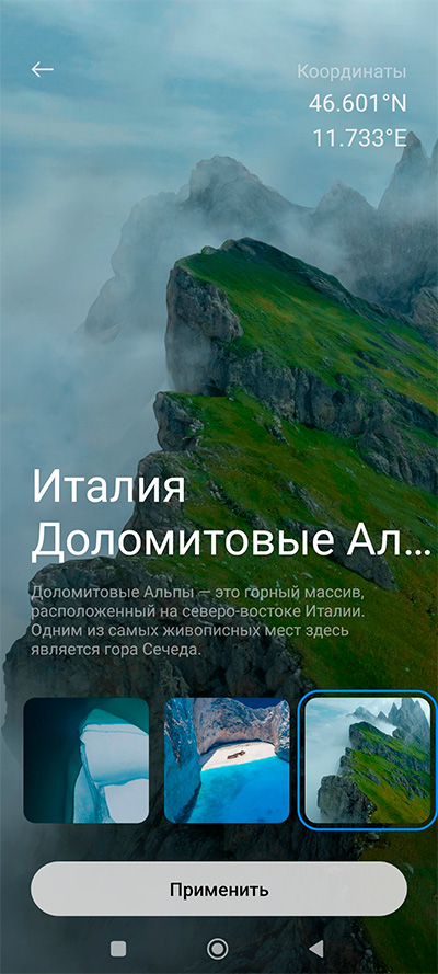 У суперобоев "Заснеженные вершины" освещение склонов горы Сыгунян будет меняться в зависимости от времени дня и от погоды, показываемой погодным приложением, - тоже эффектно смотрится.