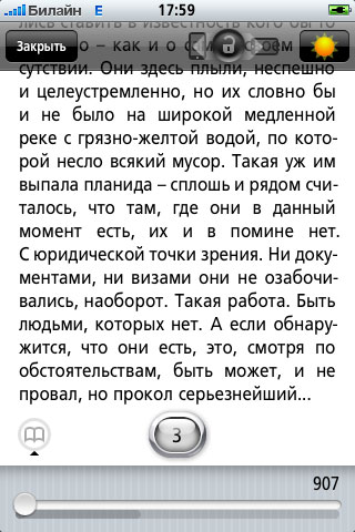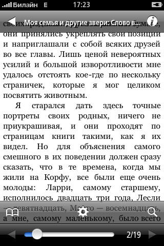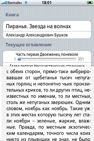 Небольшая демонстрация удобств и стиля: например, страничку можно пальцем сдвигать вниз (если отпустить, она автоматом вернется на место), и под ней обнаружится название книги, текущее оглавление и проценты прочитанного.