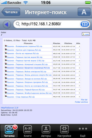 Ну и все, дальше только остается подключить iPhone через WiFi к роутеру локальной сети, после чего ввести в URL страницы адрес из адресной строки HFS (в моем случае это был http://192.168.1.2). При этом в окне ShortBook выводится удобный список (русские имена файлов и ZIP-архивы поддерживаются), где нужно просто щелкать по нужным книжкам, и они тут же будут закачиваться в iPhone.