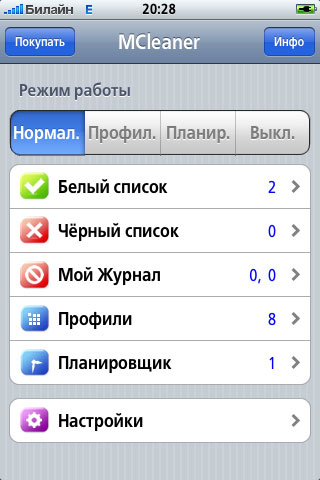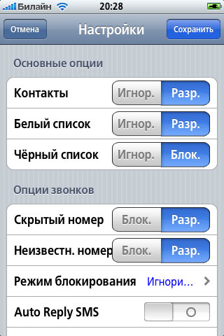 Для iPhone поначалу ничего подобного не находилось. Только какие-то примитивные фильтры (вроде Pysl), куда вручную нужно было вбивать телефоны черного и белого списков, что для меня неприемлемо.