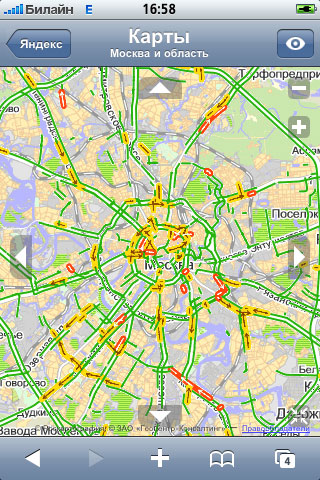 Сам "Яндекс" еще не выпустил клиент своих "Пробок" для iPhone. (А зря, кстати.) Однако есть как минимум два способа получать эти данные на iPhone. Способ первый - прямо в браузере по адресу i-maps.yandex.ru. Выглядит это все неплохо, пользоваться можно.