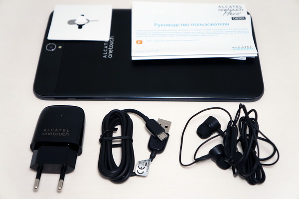 Комплект поставки: планшет, адаптер питания, кабель USB-microUSB, проводная гарнитура-затычка, скрепка для вытаскивания слота для сим-карты и SD, брошюрки.