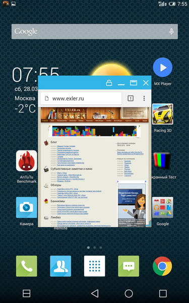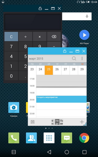 Поддержку многооконности разрабатывали в Mediatek, и здесь оконными могут становиться не только строго определенные приложения, как это, например, сделано в смартфонах Samsung, а любые приложения, даже игры: при запуске приложения на панели экранных кнопок появляется специальная пиктограмма, с помощью которой приложение можно превратить в оконное.