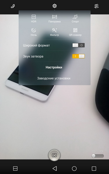 По умолчанию выставляется автоматический режим, также вы можете выбрать режим HDR (расширенный динамический диапазон), панораму, спорт, ночь, фильтр и QR-сканер.