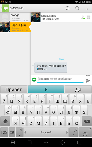 Простенькое приложение SMS/MMS. Никаких изысков. И по интерфейсу (также по настройкам) видно, что здесь установлена версия Android, рассчитанная на две сим-карты.