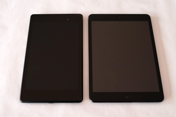 Ну и сравним Nexus 7 с iPad mini. Тут хорошо видно, что у Nexus 7 соотношение сторон дисплея - 16:9, а у айпэда - 4:3. По этому поводу, кстати, до сих пор ведутся ожесточенные споры: одни считают, что формат 16:9 - удобнее, чем 4:3, а другие утверждают, что все строго наоборот.