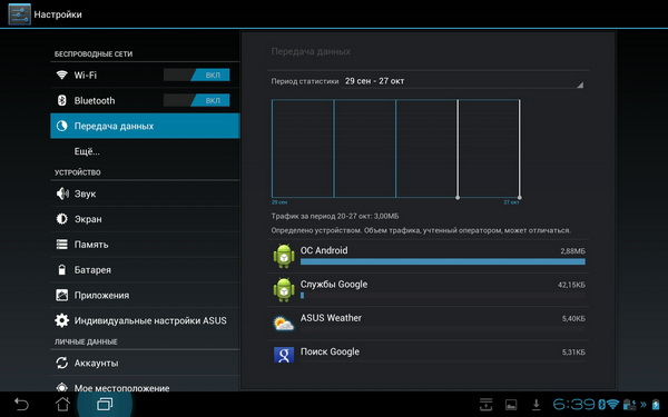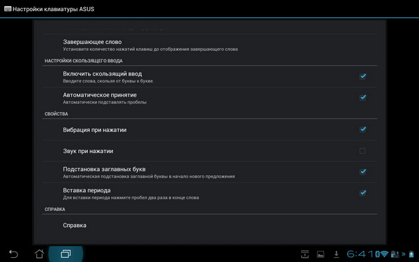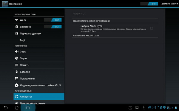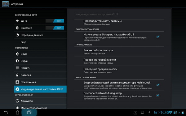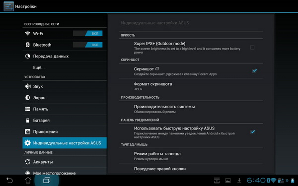 Настройки системы - в принципе, обычные для Android 4.1.1, однако есть несколько специфических для данного планшета.