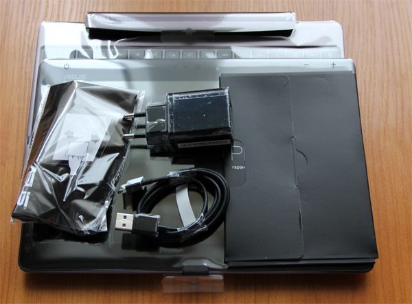 Набор причиндалов тут следующий: планшет, док-станция с клавиатурой, специальный USB-кабель, адаптер питания, брошюрки, тряпочка для протирки дисплея.