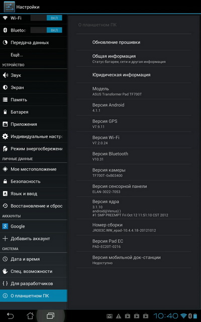 Ну, по сравнению с Transformer Prime TF201 тут, в общем, очень мало что изменилось, за исключением разве что разрешения дисплея. Однако практика работы с операционной системой Android показывает, что разрешение здесь не играет такую же важную роль, как, например, в случае с Windows 7. Впрочем, мы об этом еще поговорим позже.