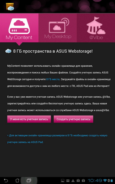 Пакет программ, включающих в себя асусовское облако (бесплатно дают 8 Гб хранилища), приложение для удаленного доступа к десктопу персонального компьютера, ну и того же центра развлечений @Vibe.