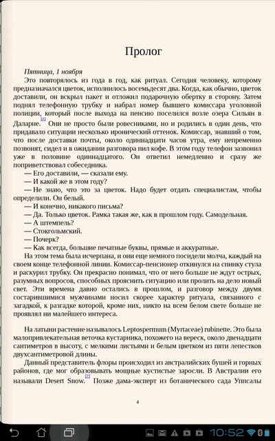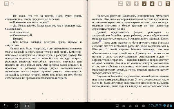 Ридер поддерживает режим разворота (в альбомном режиме), изменение размера шрифта, закладки.