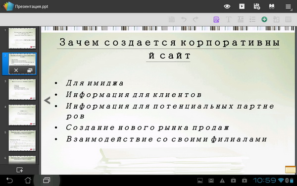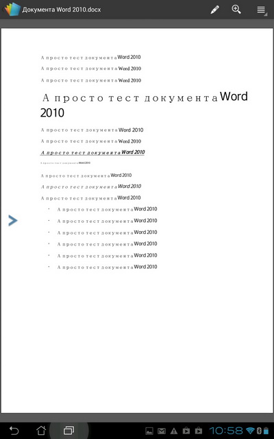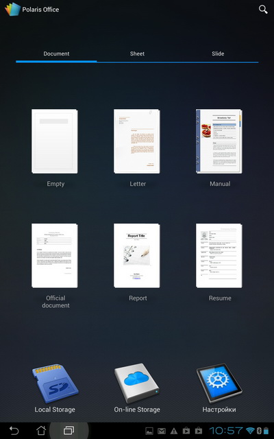 Очень неплохой вариант планшетного офиса - поддерживает соответствующие документы MS Office вплоть до версии 2010: текстовые документы, электронные таблицы и презентации.