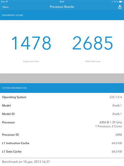 Измерил производительность процессора и памяти по тесту Geekbench 3. Тот выдал следующее (данный iPad тест почему-то определяет как iPad 4,1).