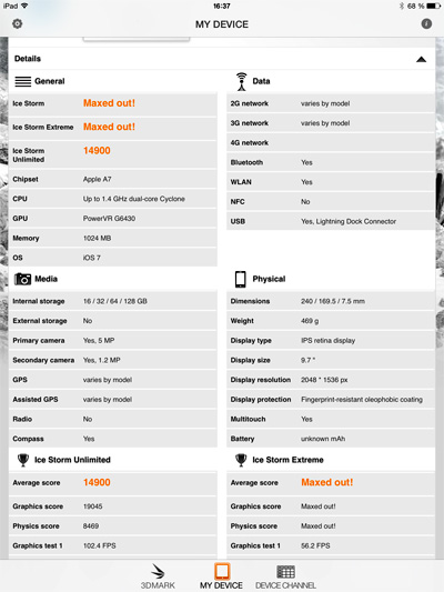 3D Mark на двух тестах выдал аж Maxed Out, а на третьем показал 14900. Для сравнения, на iPad 4 он показал индекс 9197.