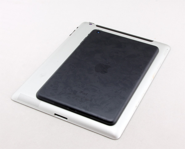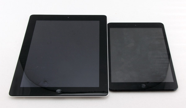 Вот они, красавцы. И тут хорошо видно, что при ненамного меньшем размере экрана (8" против 10" - не такая уж большая разница) iPad mini явно меньше по линейным размерам самого устройства.