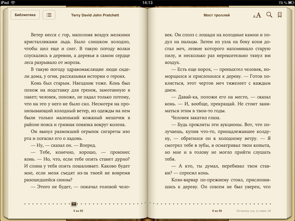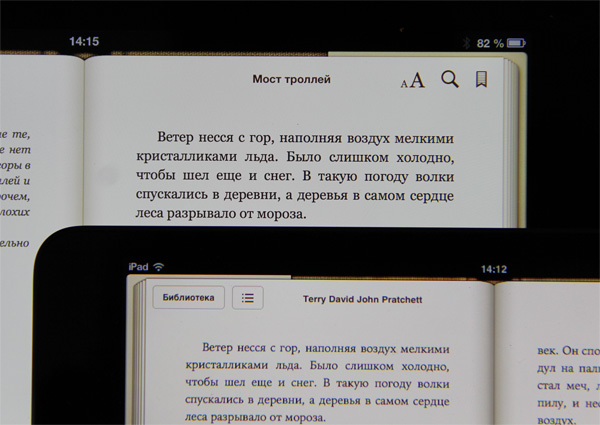 Однако разница с iPad 3 ощущается. Фотография разницу передает плохо, но когда сравниваешь одинаковые книги на iPad 3 и iPad mini - видно, что на iPad 3 текст выглядит заметно четче и, соответственно, читать комфортнее.