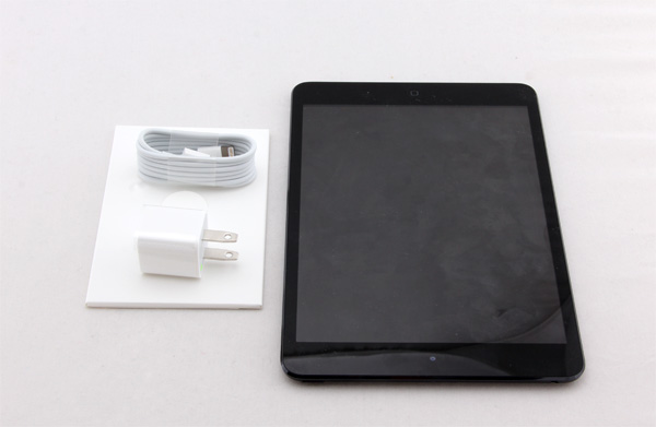 Комплектация: планшет, USB-кабель, адаптер питания, конверт с брошюрками и наклейками с яблочком.