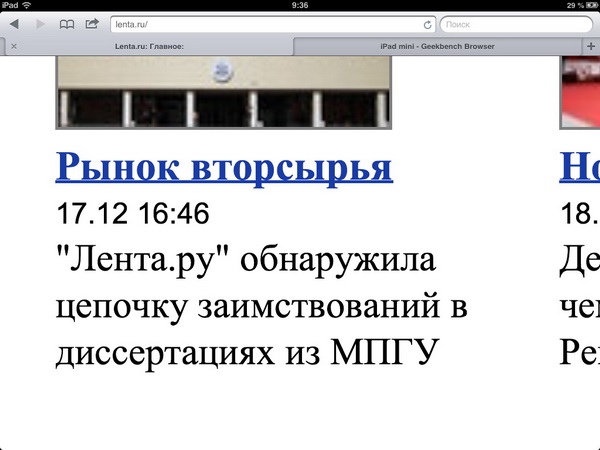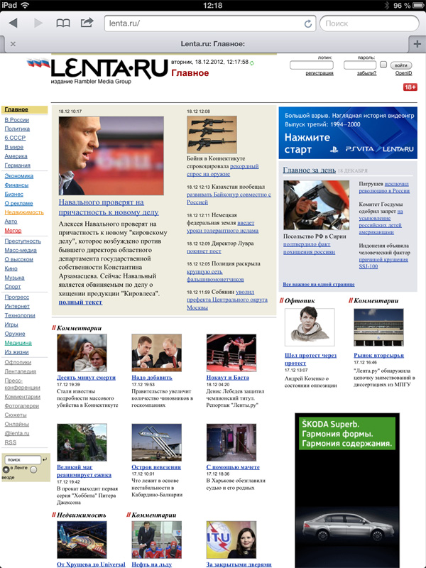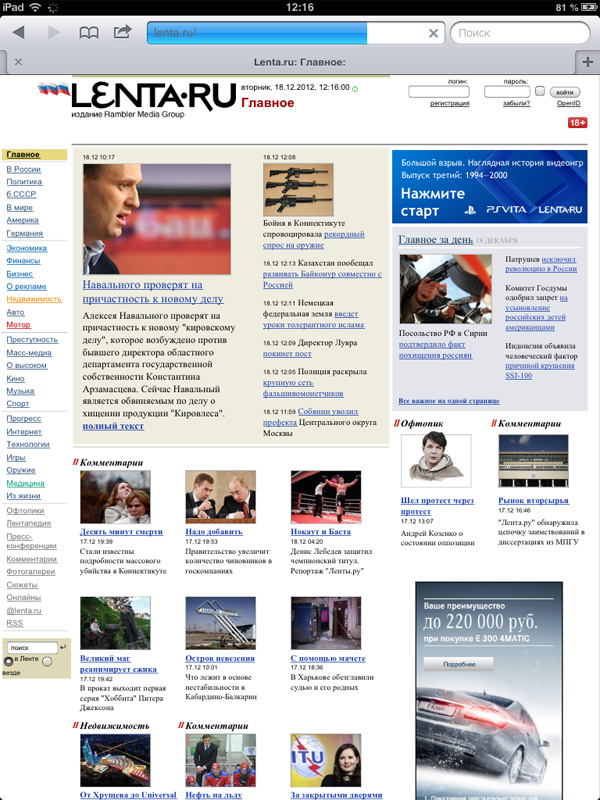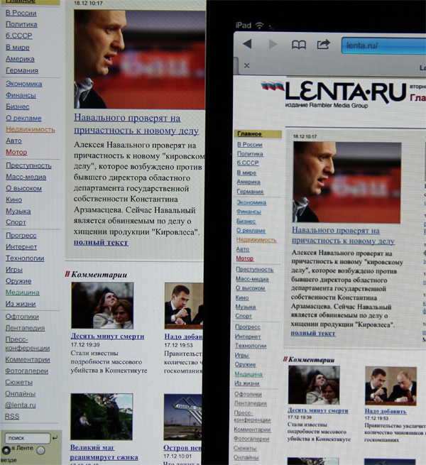 Браузер на разрешении 1024х768 сайты показывает совершенно нормально, и никакого дискомфорта это не вызывает. Мы помним, что у iPad 3 с Retina разрешение 2048x1536 пикселов, однако такое разрешение сайты не поддерживают, поэтому у обоих планшетов на экран влезает практически одно и то же, просто у iPad 3 картинка смотрится лучше и четче. (Особенно заметно это на тексте.)