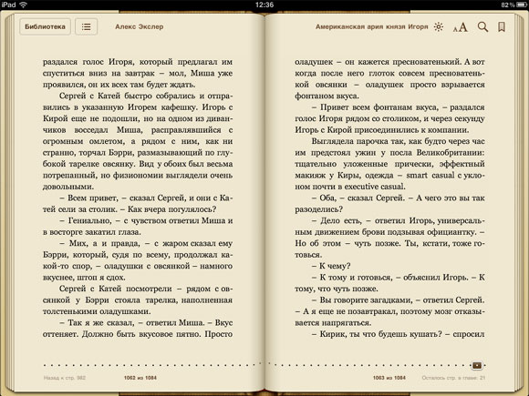 При этом, конечно, с тоской вспоминаешь базовую айпадную программу iBooks - это просто небо и земля. Вот сравните.