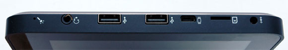 Практически все порты и слоты расположены на левом торце: наушники, два USB, видеовыход, слот для microSD, питание.