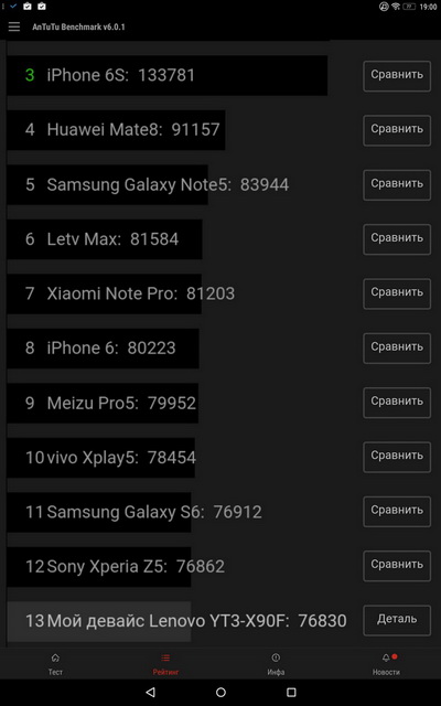 Итоговая табличка по AnTuTu. 76830 единиц. У Nexus 9 - 60954.