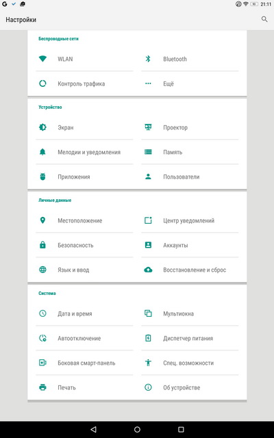 Настройки - стандартные андроидные, с небольшими модификациями.