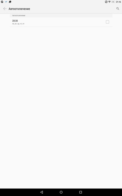 Есть автоотключение и почему-то нет автовключения. Впрочем, для планшета это не особенно актуально.