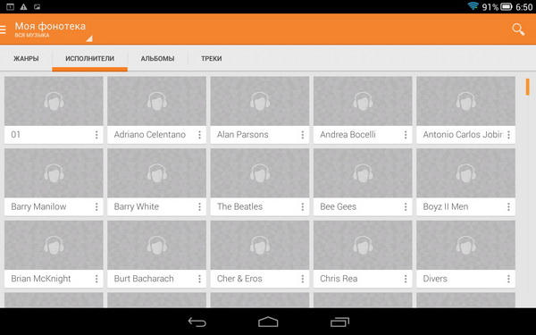 "Play Музыка". Отбор аудиотреков по жанрам, исполнителям, альбомам, трекам.