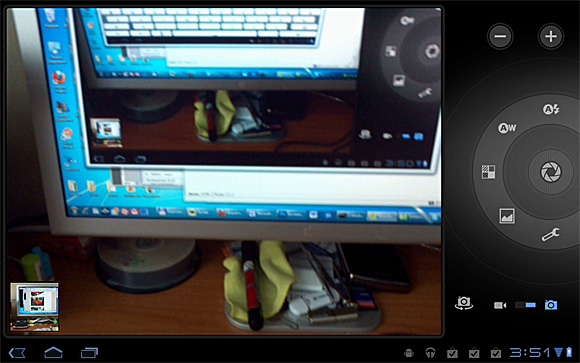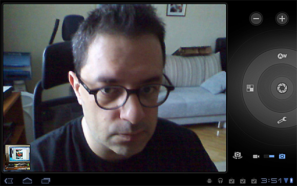 В устройстве аж две камеры - фронтальная, для видеозвонков, и на задней крышке. (Привет второму айпаду.) Оно, конечно, забавно, но не очень понятно, зачем нужна вторая камера, - чай не телефон, снимать таким подносом вряд ли кто-то будет. Получается, что вторая камера (достаточно приличная в отличие от iPad 2 - все-таки 5 Мпикс) - только для того, чтобы в процессе разговора собеседнику показать то, что вы видите сами, более не для чего. Ну и тут нужно учесть, что Skype под Android пока никакие камеры вообще не понимает (под iOS уже понимает), так что на данный момент эти камеры вообще толком использовать нельзя.