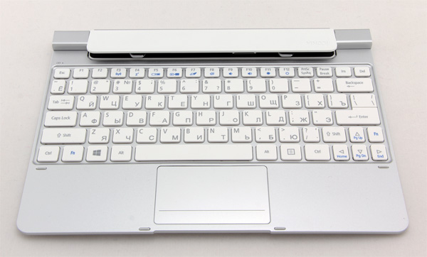 Док-станция отделана серебристым пластиком, клавиши - белые, под цвет посадочного гнезда для планшета.